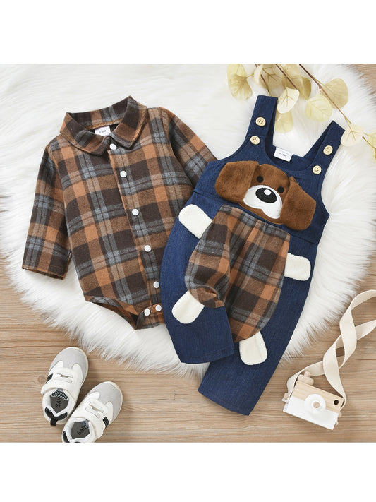 0.0-59.06ft Infant Baby Boy Spring Outfit Set: Adorable Soft Cotton Plaid Romper with Cute Cartoon Dog | Matching Long Sleeve Suspender Pants | Easy-Dressing Baby Clothes, Perfect for
