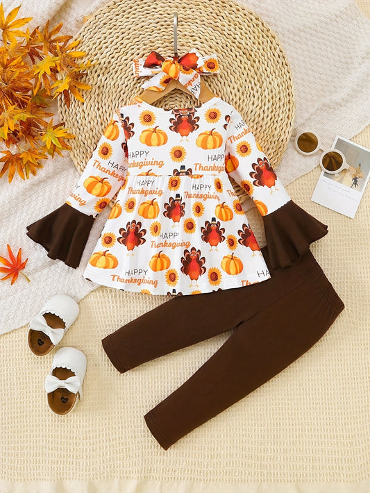 Baby Girl'S Thanksgiving Outfit - Festive Pumpkin & Turkey Print Top with Ruffled Sleeves, Brown Pants, and Matching Shoes, Perfect for Fall Celebrations, Thanksgiving Baby Clothes, for Outdoor