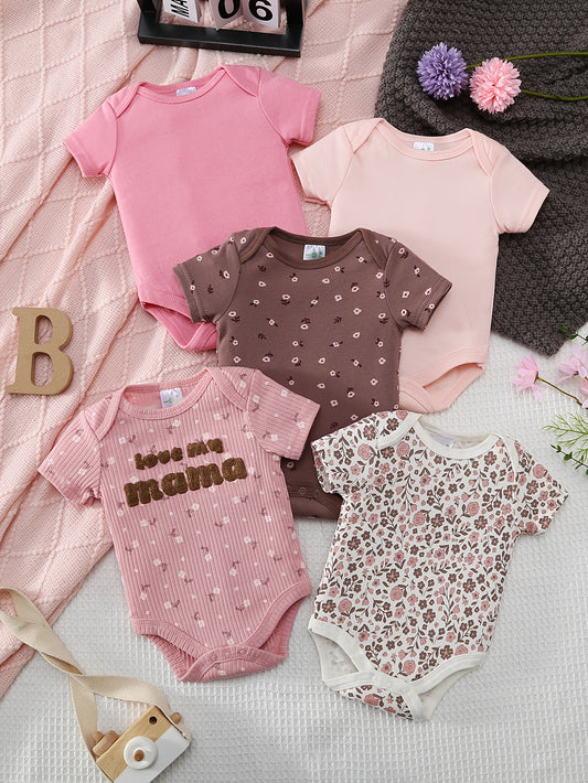Newborn Short Sleeve Jumpsuit 5pcs Set Flower Print Embroidered Triangle Jumpsuit, Ha Clothes Outfit Set 0-9 Months Baby Clothes, Suitable for Outdoor Wear