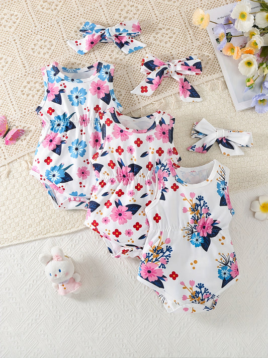 Infant 6pcs Set of Floral Print Rompers with Buttoned Bottoms and Headbands, Essential Baby Clothes, Perfect as Gifts, Perfect for Outdoor