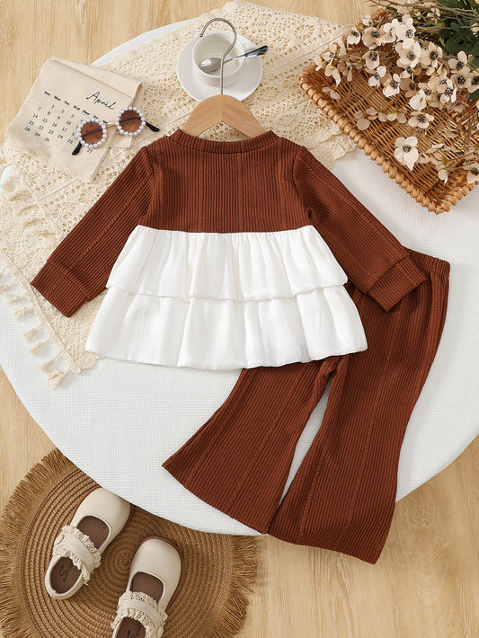 2pcs Girls' Long Sleeve Ruffled Hem Top & Flared Pants Set - Brown & White Bow-Decorated Outfit, Soft Stretchy Fabric, Perfect for Fall, Cute Elegant Playwear, Seasonal Wear, Ruffled Hem Design, Comfortable Fit, for Outdoor,