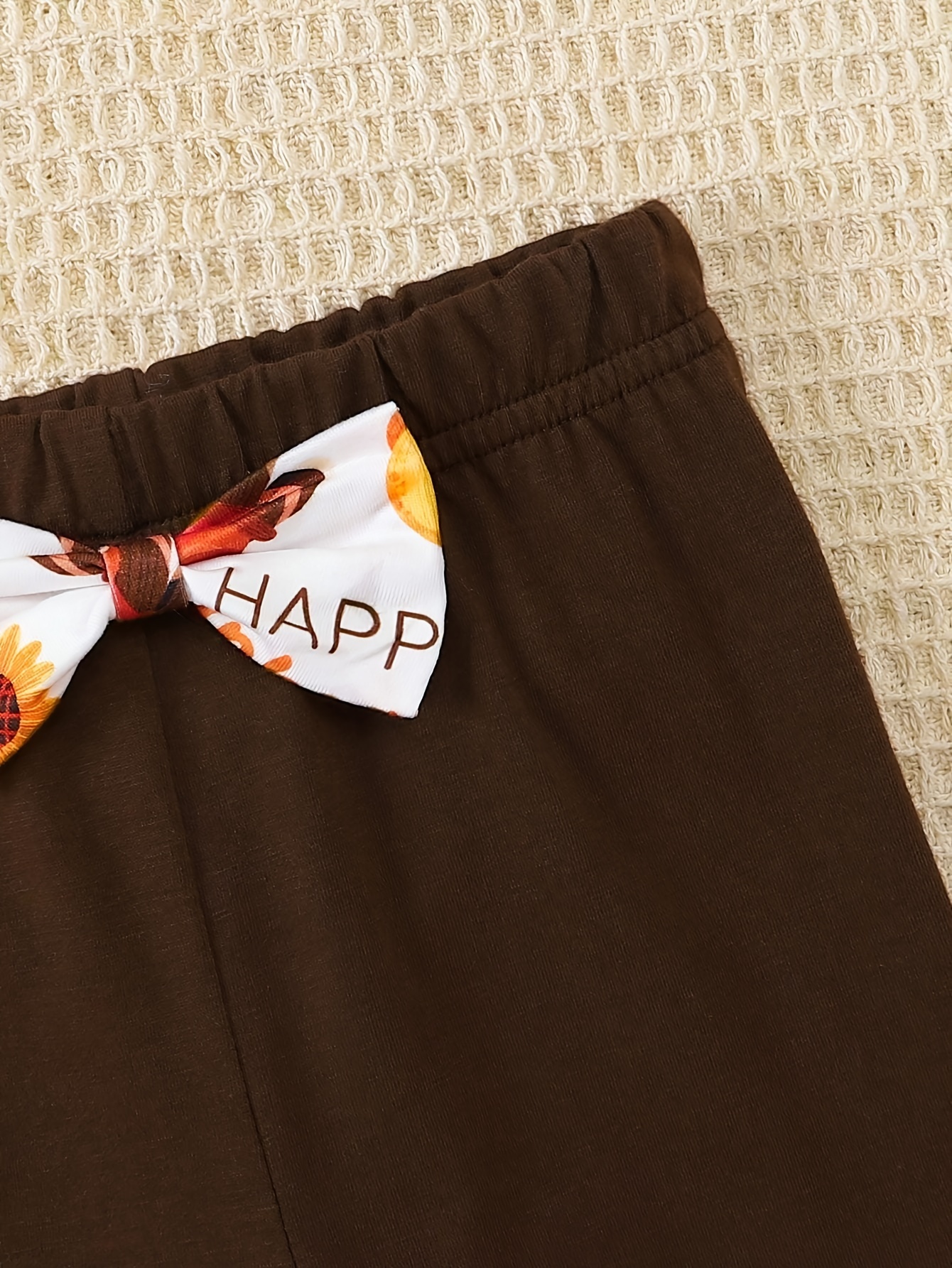 Baby Girl'S Thanksgiving Outfit - Festive Pumpkin & Turkey Print Top with Ruffled Sleeves, Brown Pants, and Matching Shoes, Perfect for Fall Celebrations, Thanksgiving Baby Clothes, for Outdoor