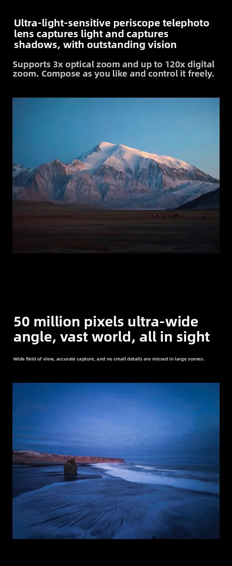 Telephoto: 50-megapixel super light-sensitive periscope telephoto lens, supports 5x optical zoom + OIS, and provides clear picture quality for long-distance shooting.