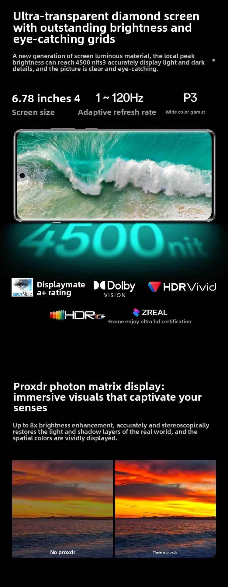 Size and shape: 6.78-inch AMOLED curved screen, supports 120Hz adaptive refresh rate, taking into account smoothness and power consumption.